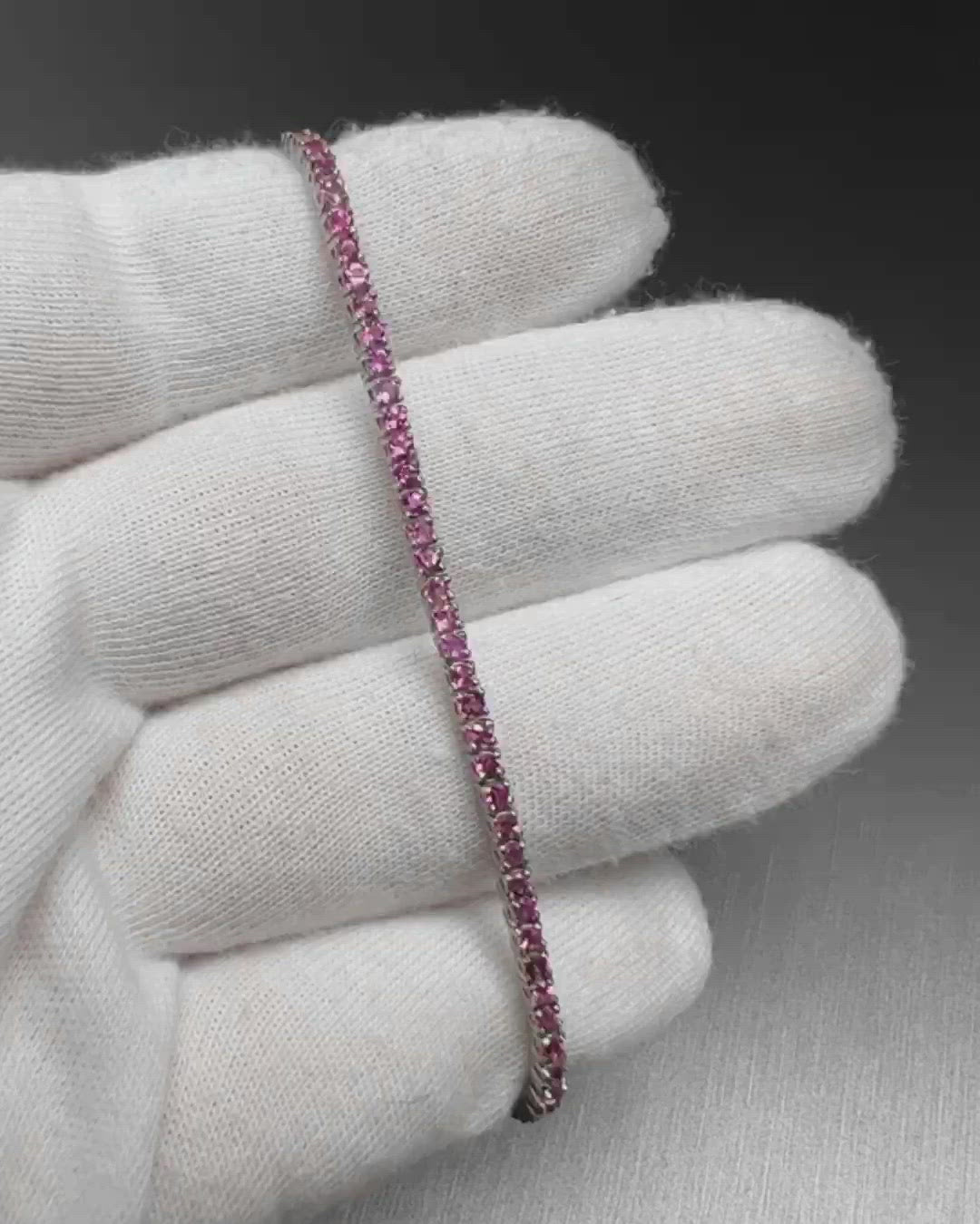 A Riviera Turmalina Rosa possui pedras naturais cravejadas em torno da pulseira. A Turmalina Rosa é uma das pedras preciosas mais desejadas da alta joalheria. Além da sua cor rosa neon e uma beleza única, a Turmalina Rosa é conhecida por ser a pedra do amor e do emocional.